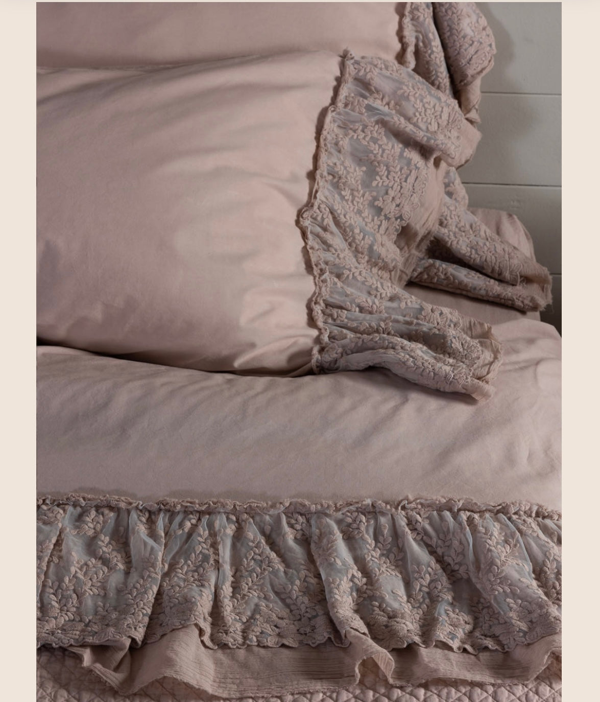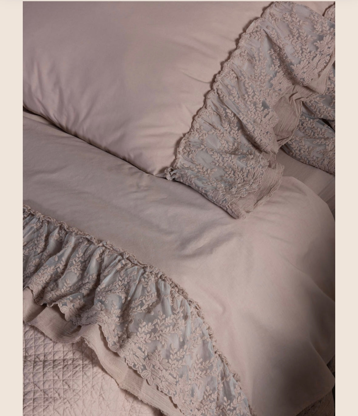 Completo lenzuolo realizzato sul nostro morbido cotone tinto in capo. Arrichito da una delicata e preziosa rouche di tulle ricamato e garza. La gala delle federe è solo su un lato. Disegnato e prodotto in Italia