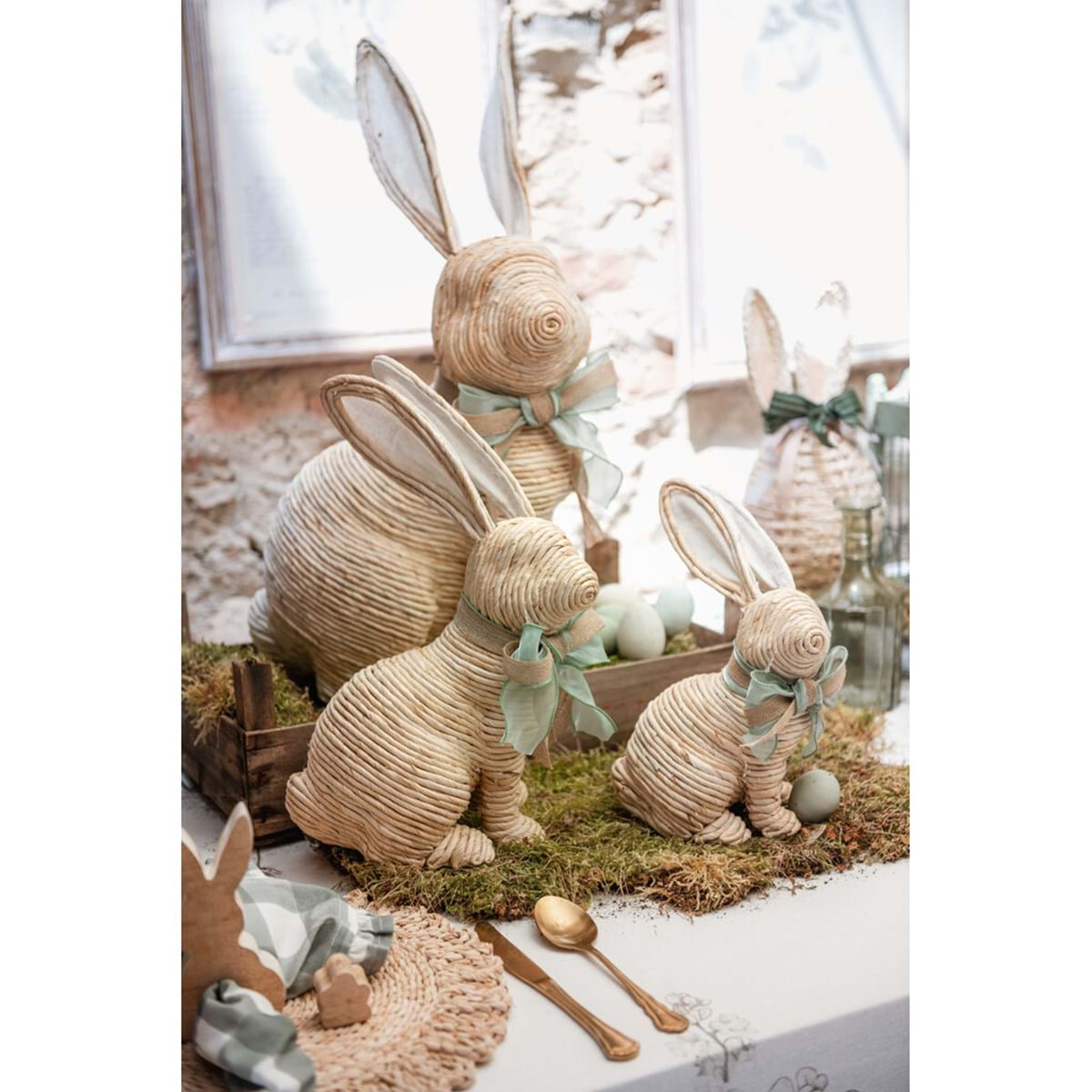 Aggiungi un tocco di dolcezza alla tua casa con il decoro coniglietto collezione 'Pomona' di Blanc Mariclò. Realizzato in fibra di mais, questo adorabile coniglio è decorato con un bellissimo fiocco, perfetto per la Pasqua o per dare un tocco primaverile in ogni momento dell'anno.