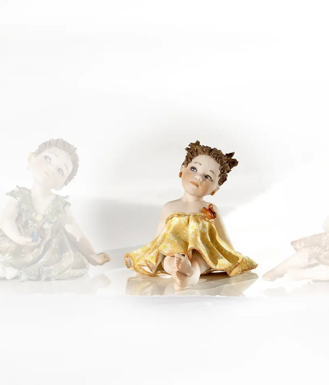 Figura in porcellana raffigurante un’allegoria dell’estate. Indossa un abito a fiori gialli e bianchi e porta i capelli legati in due alte codine, mentre lascia che una farfallina arancione le si appoggi sul vestitino, in ammirazione dei suoi piccoli orecchini gialli.