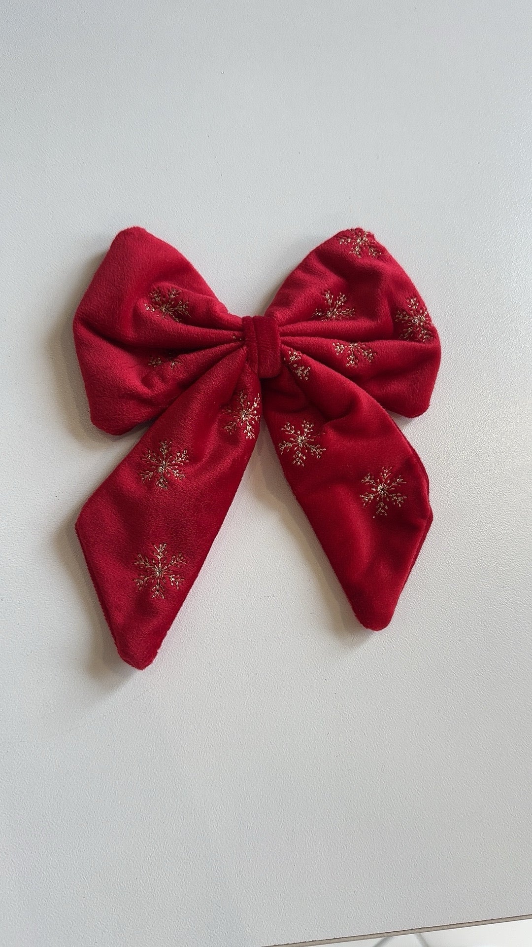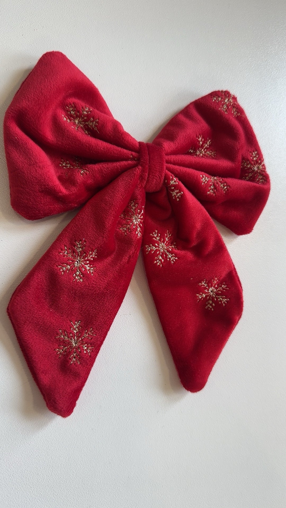 Questo fiocco in velluto rosso è perfetto per abbellire l'albero di Natale o per decorare i pacchi regalo. Il suo decoro di stelline oro aggiungerà un tocco elegante e festoso. Aggiungi un tocco di classe alle tue festività con questo fiocco unico.