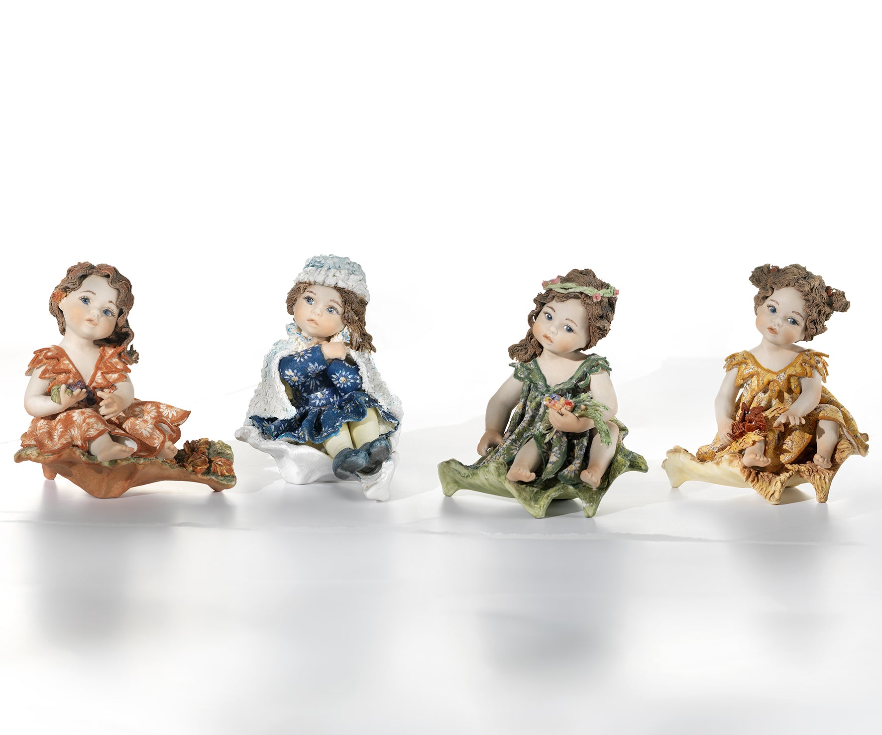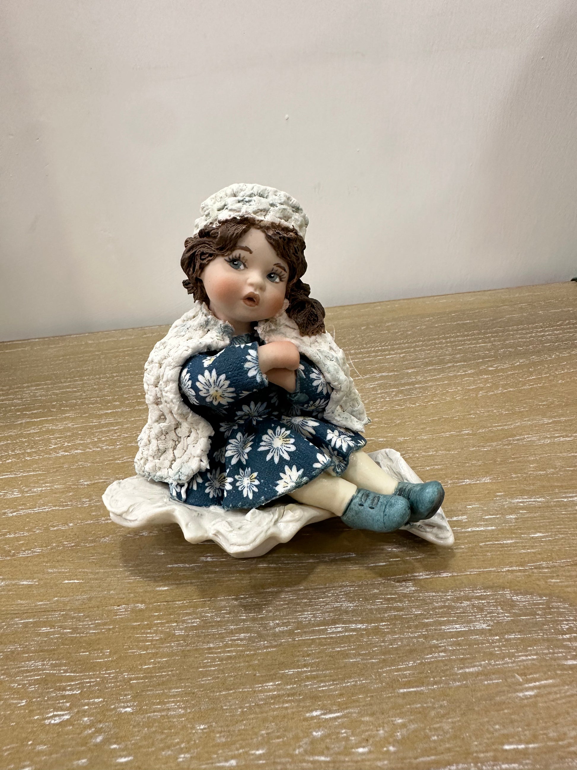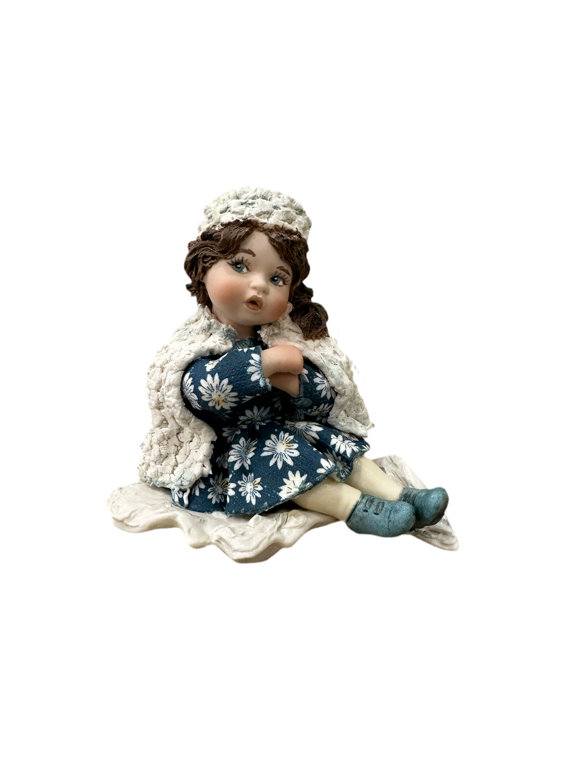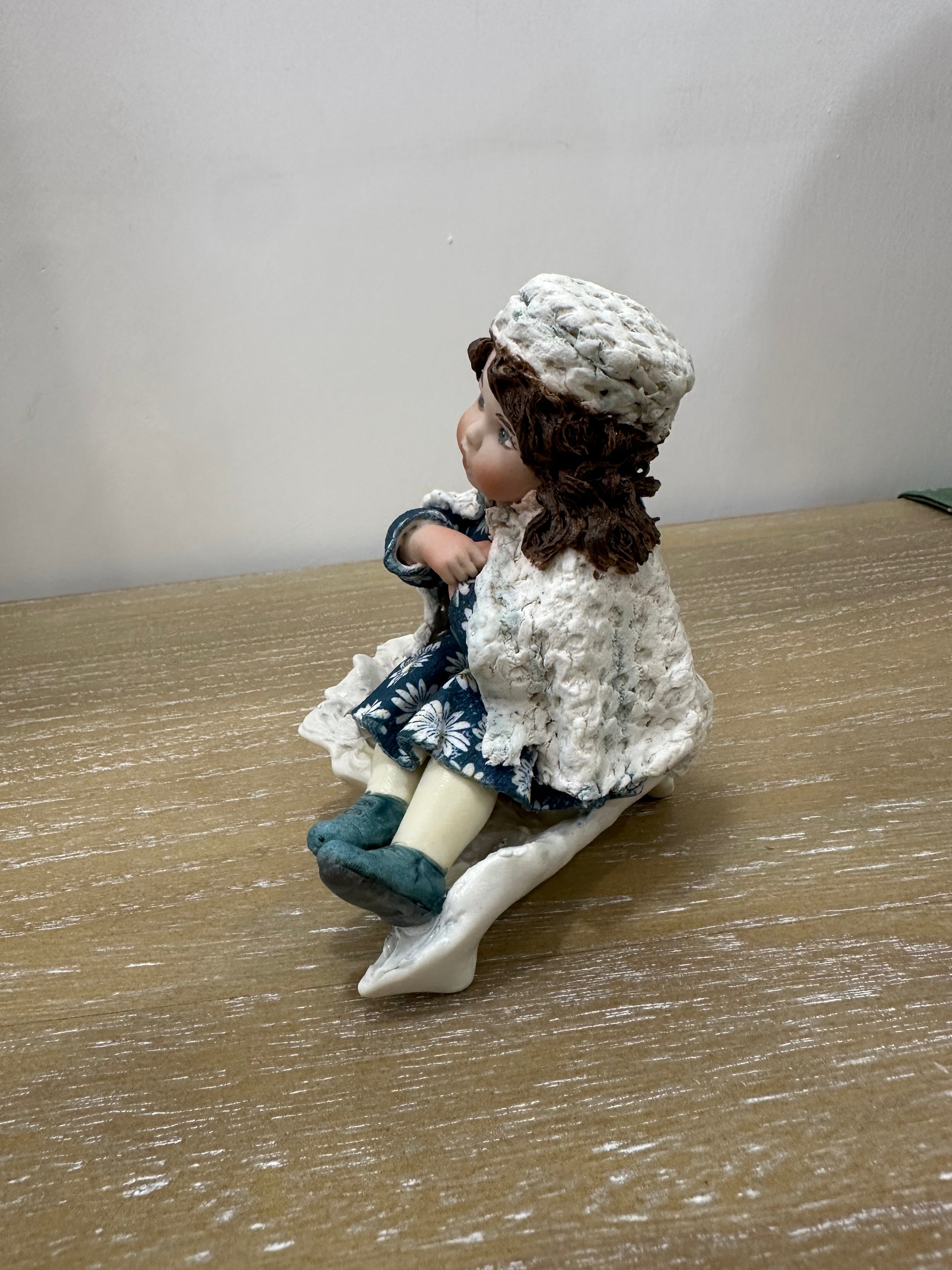 Figura in porcellana raffigurante un’allegoria dell’inverno. Indossa un abito a fiori blu dai cuoricini gialli e porta i capelli sciolti su una spalla sotto ad un berretto azzurro e bianco. Siede su una base di neve appena caduta mentre si stringe nel suo caldo manto di lana bianca.