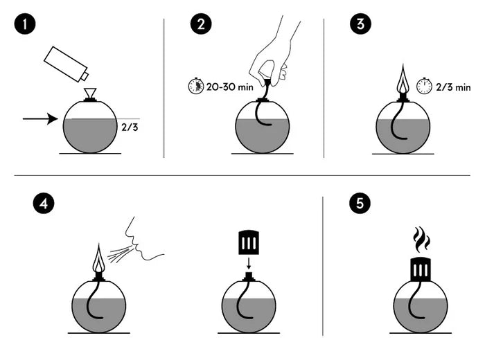 Riempie la lampada catalitica con la fragranza, lascia impregnare lo stoppino e accendi la lampada per pochi minuti. Spegni la fiamma e lascia che la fragranza avvolga l'ambiente. Per interrompere la diffusione, posizionare il tappo sulla lampada.