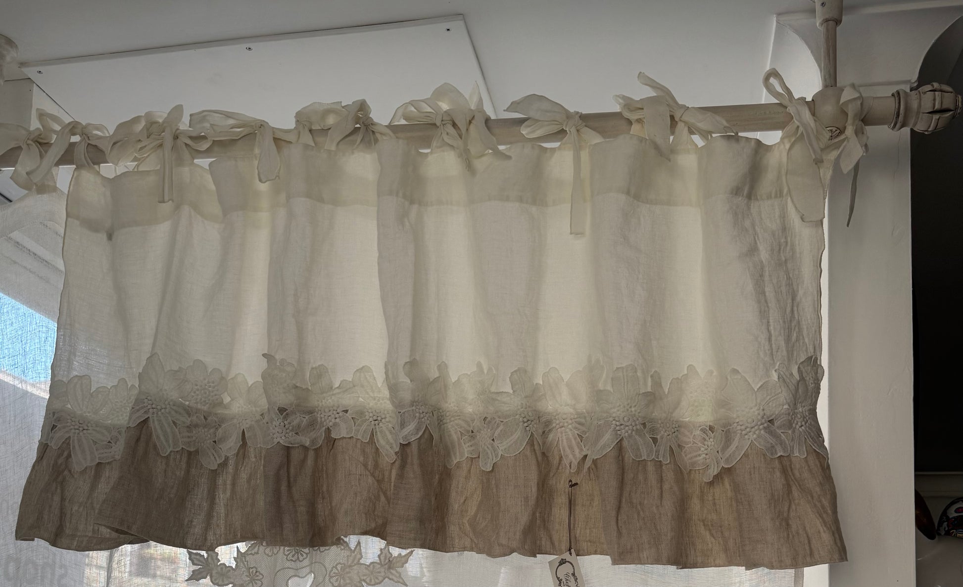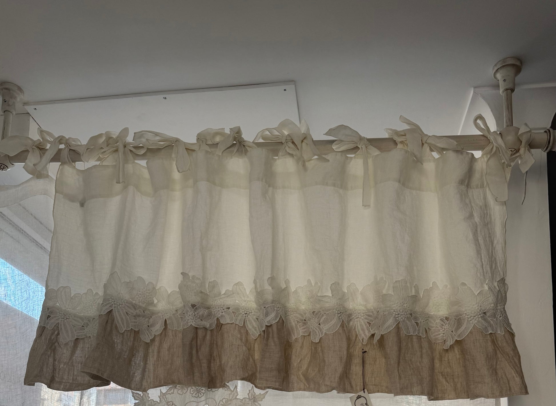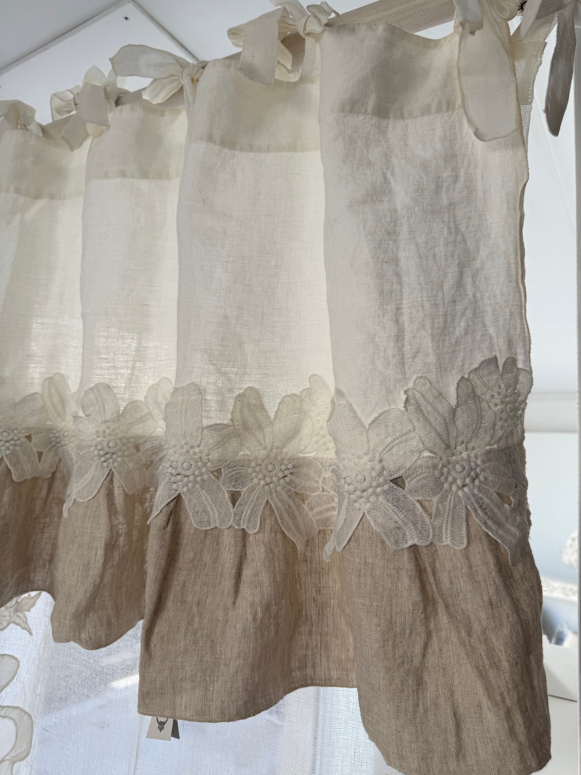 Una mantovana dal design raffinato in lino con balza colore argilla e decoro di fiori. Ideale per decorare finestre del bagno e sottolavelli o per impreziosire tende basiche.