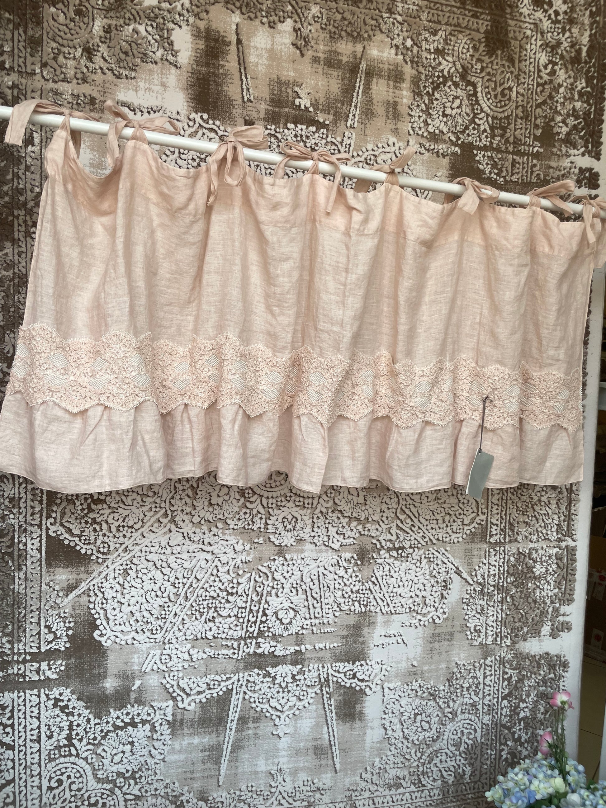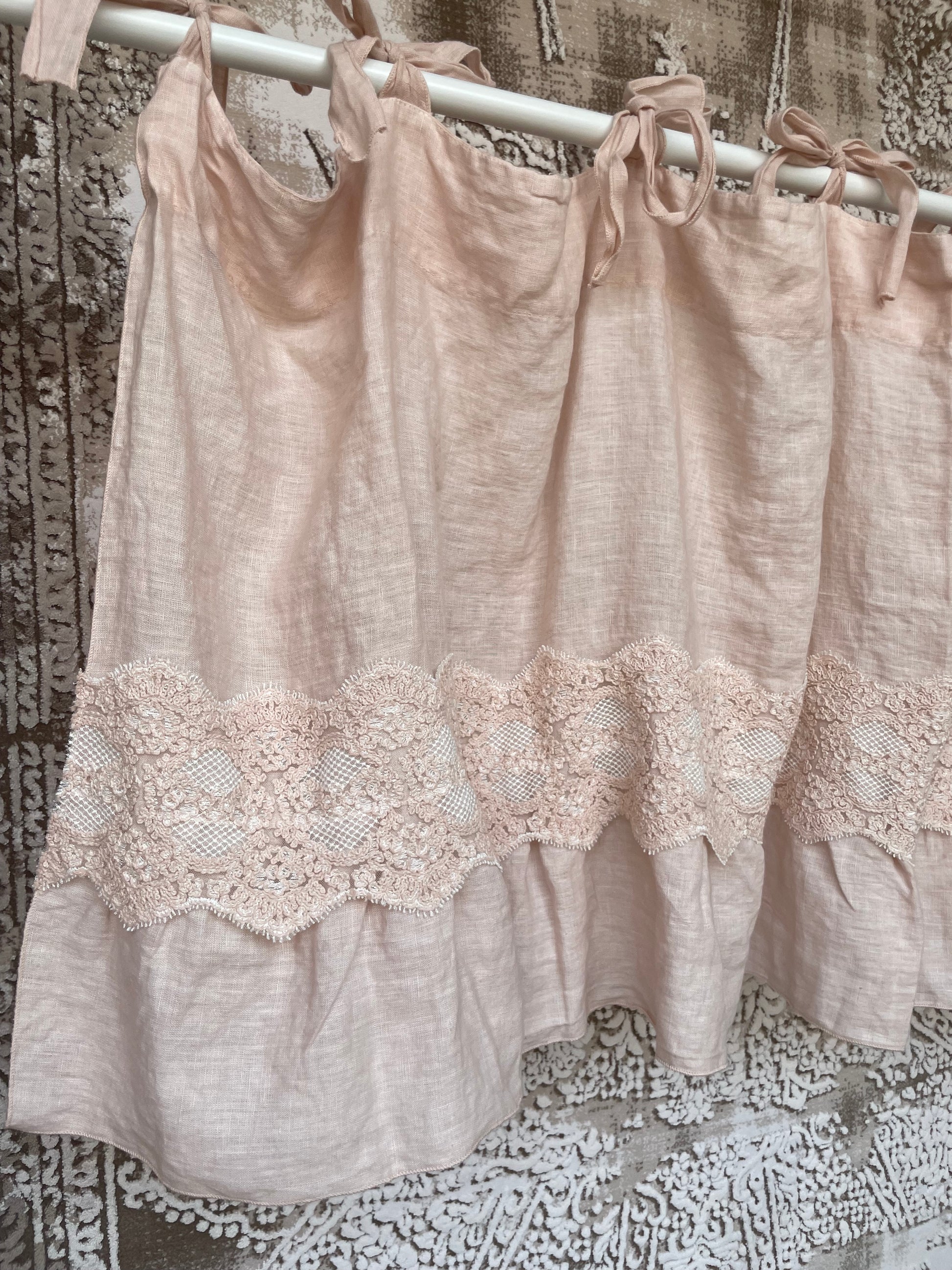 Una mantovana dal design raffinato, con pizzo Petra e passante bastone in lino. Ideale per decorare finestre del bagno e sottolavelli o per impreziosire tende basiche.
