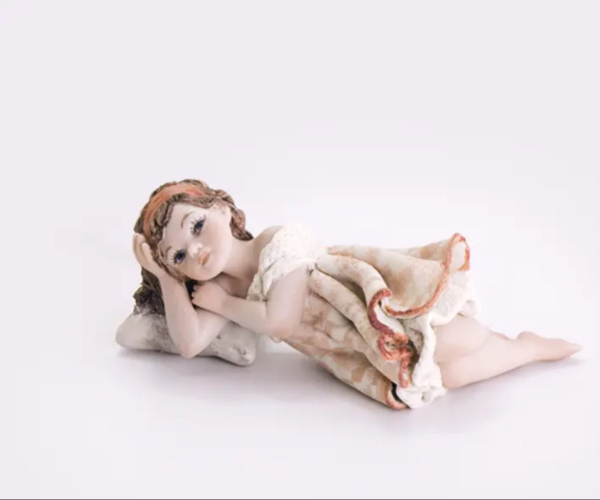 Questa figurina in porcellana rappresenta una bambina stesa a terra con la testa appoggiata su un morbido cuscino grigio perla. Indossa un abito dalla fantasia rosa e bavero e sottogonna in tulle, e porta i capelli sciolti sulle spalle, ordinati da un’ampia fascia sulla fronte.