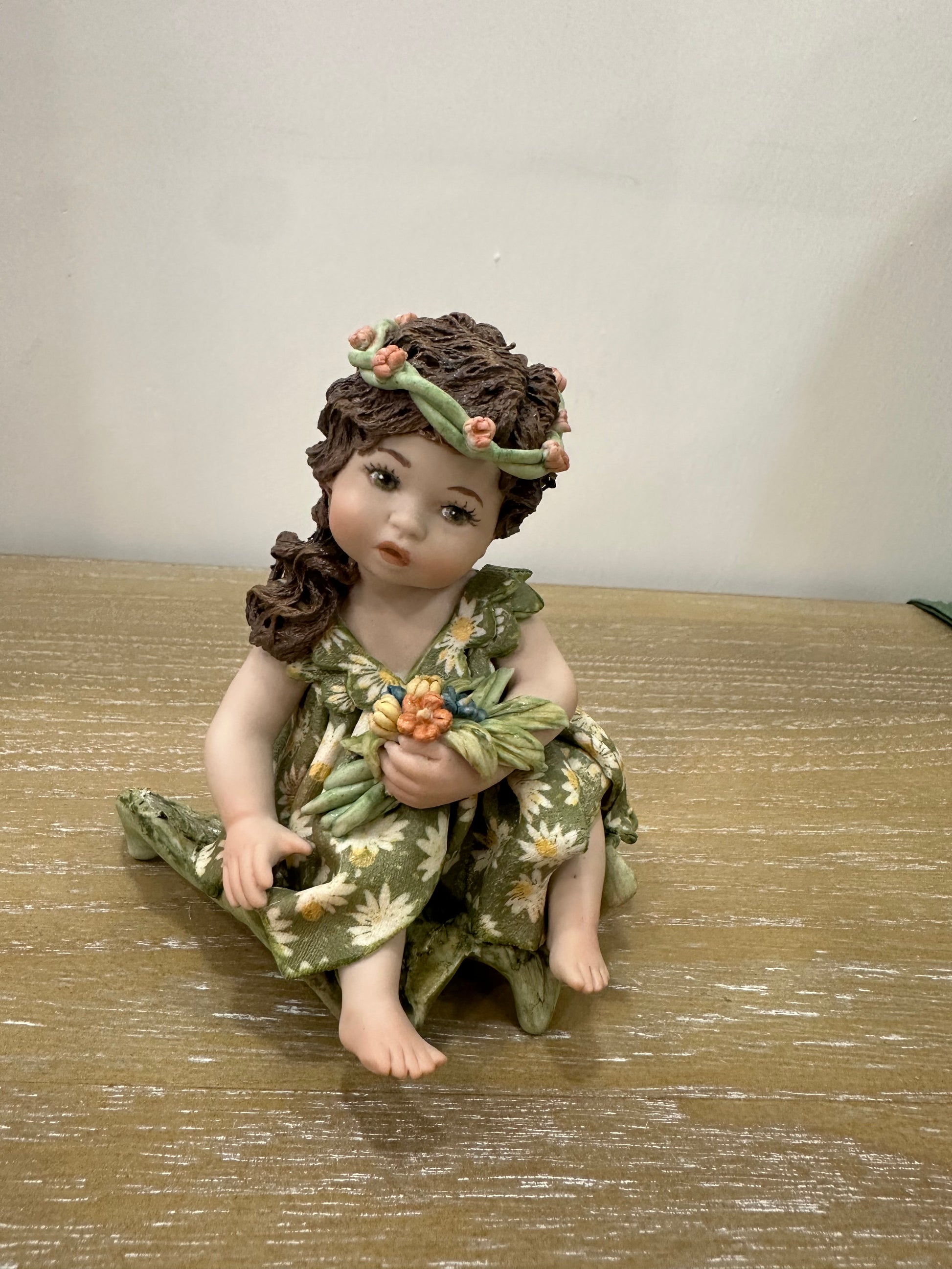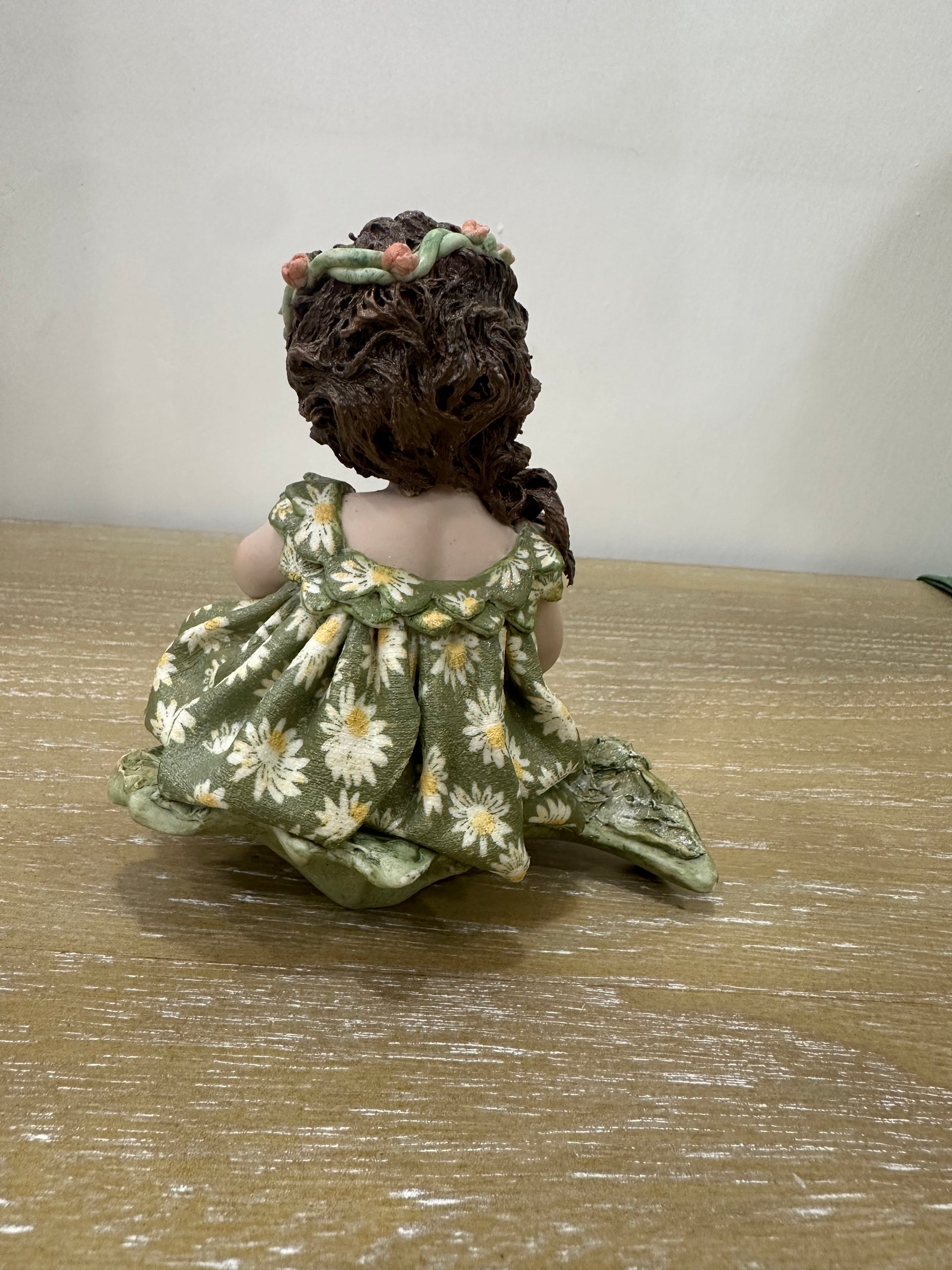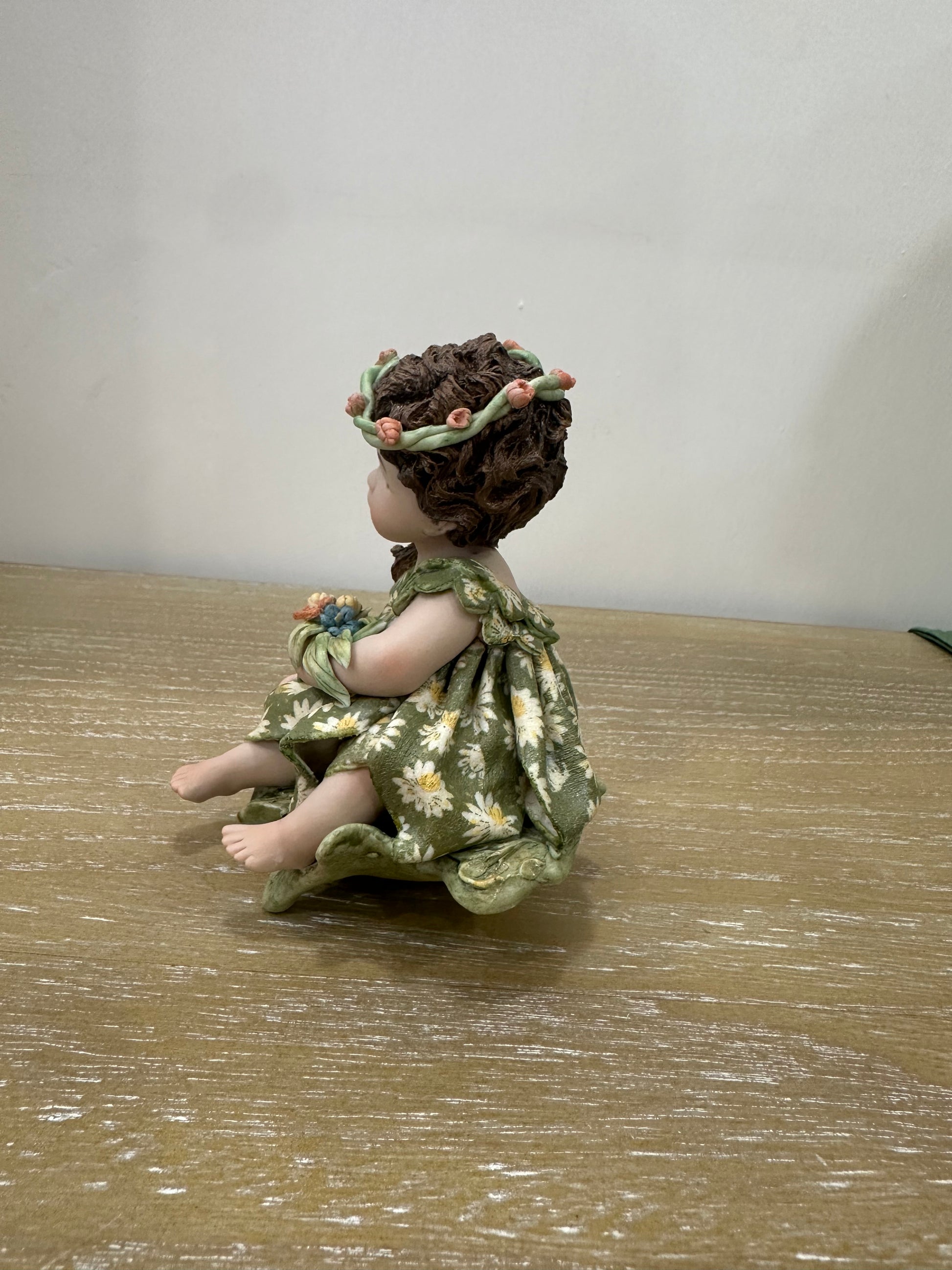 Figura in porcellana raffigurante un’allegoria della primavera. Indossa un abito a fiori verdi dai cuoricini gialli e porta i capelli sciolti su una spalla sotto ad una coroncina di fili d’erba intrecciati a fiori rosa. Siede su una base di muschio su cui stanno sbocciando piccole erbe colorate e tiene in mano un mazzo dei primi fiori dell’anno.
