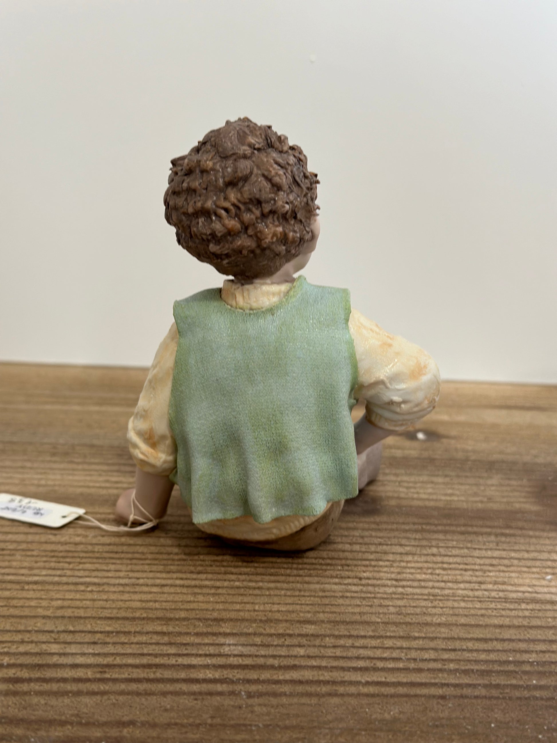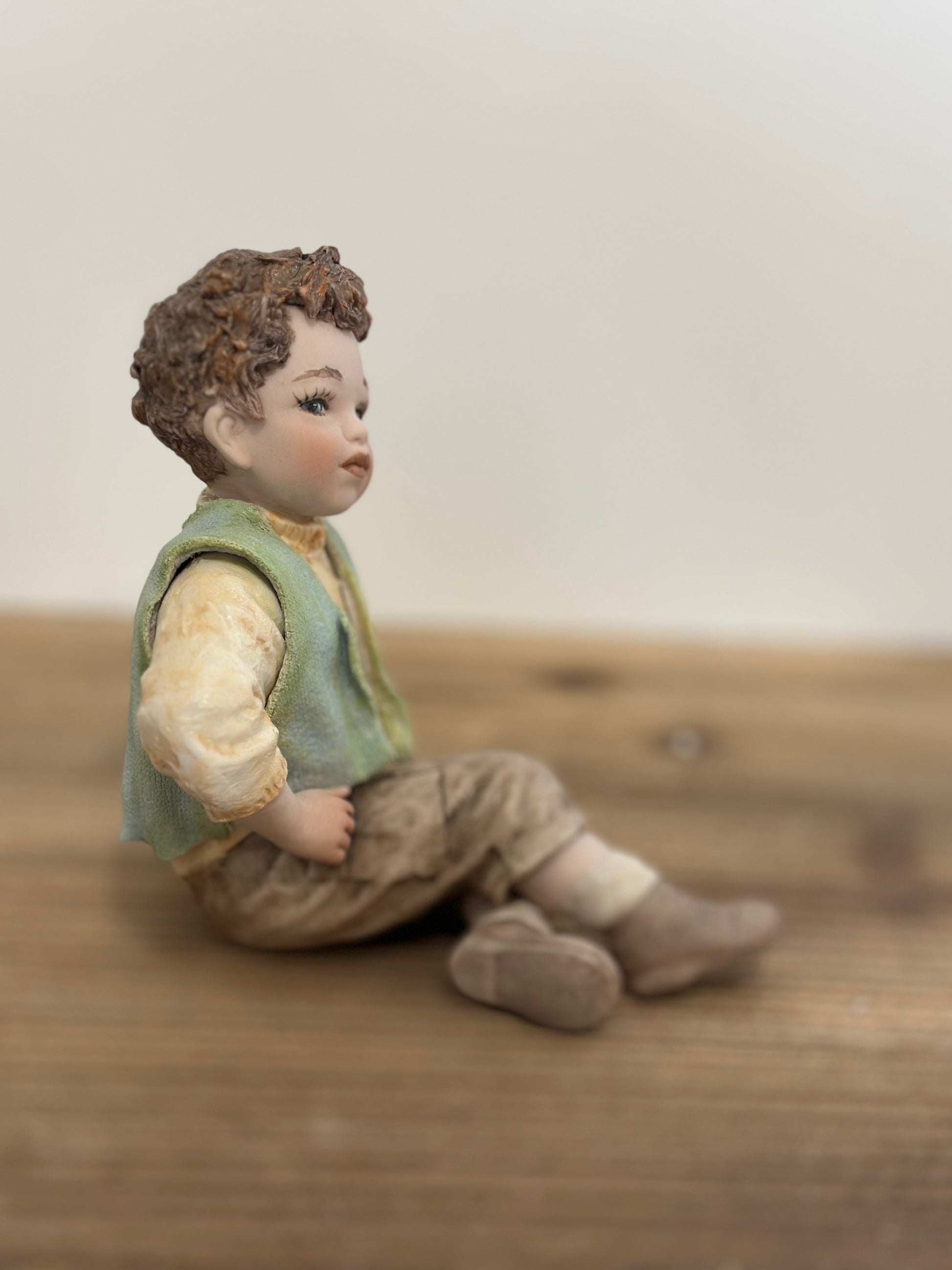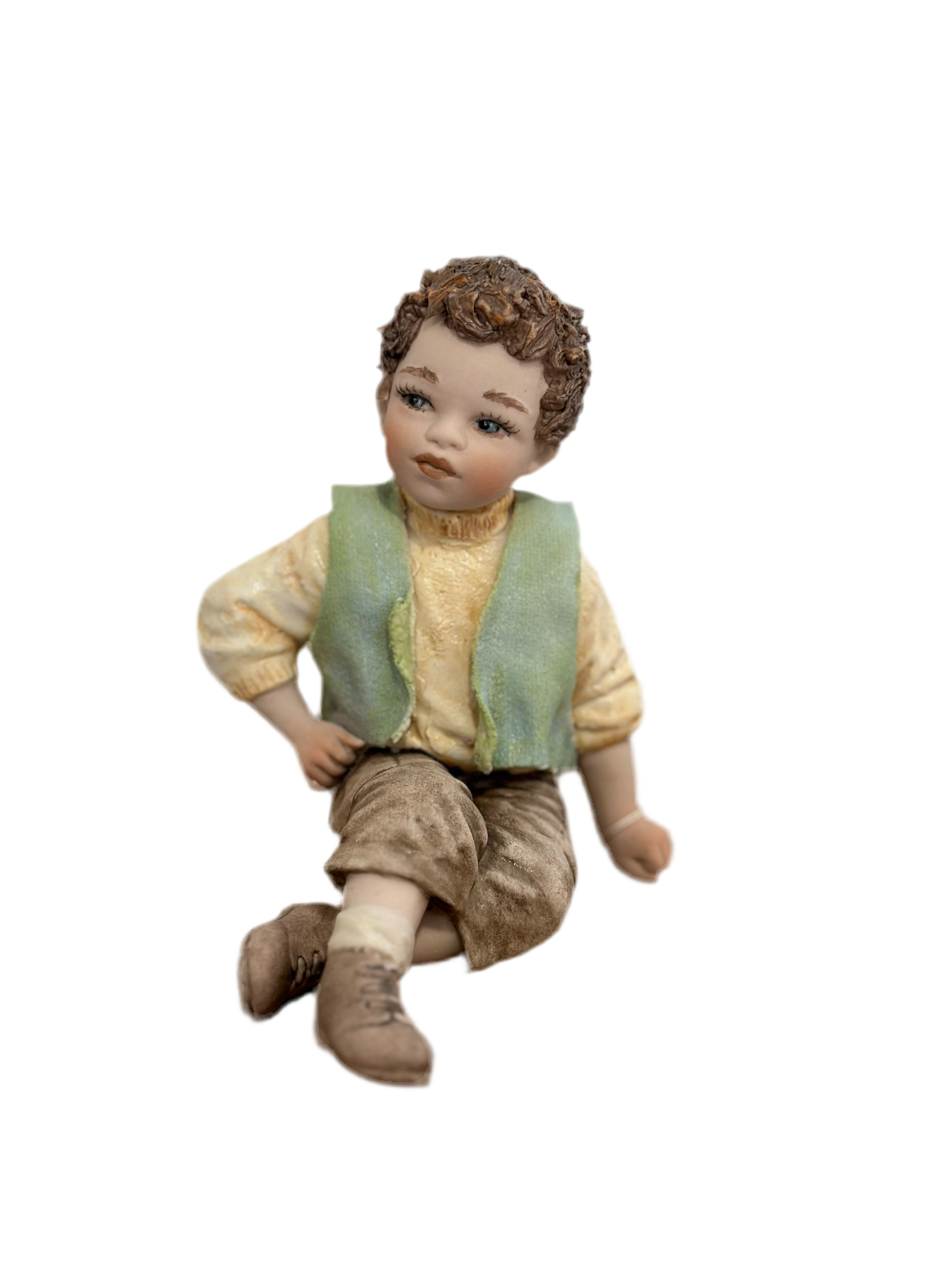 Statua in porcellana raffigurante un giovane ragazzo seduto a terra, come in attesa di qualcosa, in compagnia della sua amica Clelia. Indossa un maglioncino color salmone con sopra un gilet marrone e dei pantaloni alla zuava.