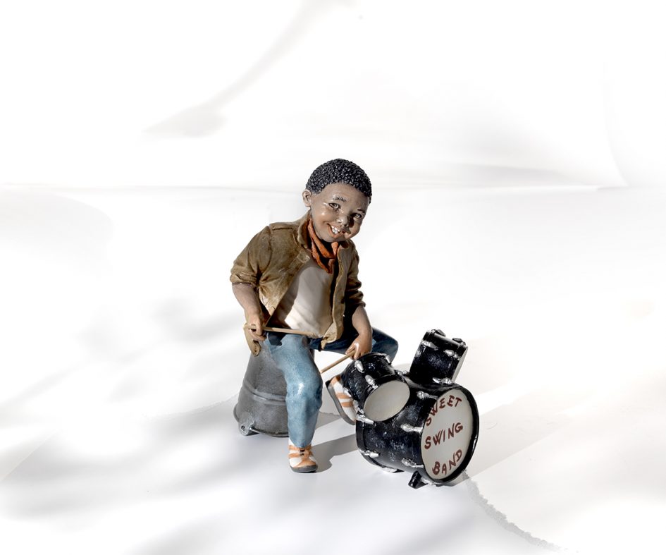 Figura in porcellana raffigurante un batterista dalla pelle nera. Indossa una giacca da James Dean su una maglia bianca, jeans lunghi e una bandana rossa attorno al collo. Siede su un secchio ed è molto felice di dare il ritmo ai suoi amici suonatori, con cui forma la Sweet Swing Band, l’orchestra jazz ufficiale di Sibania.