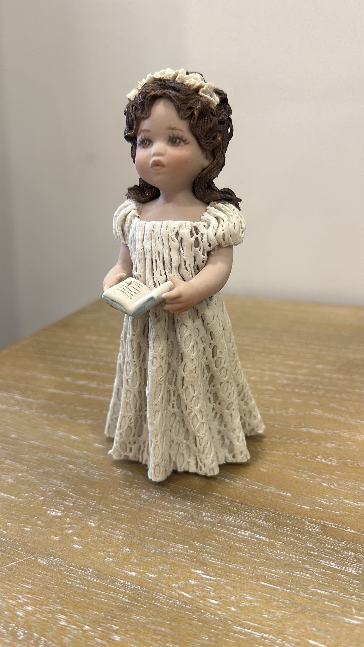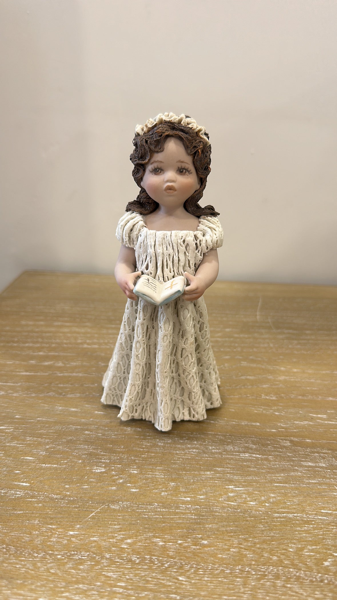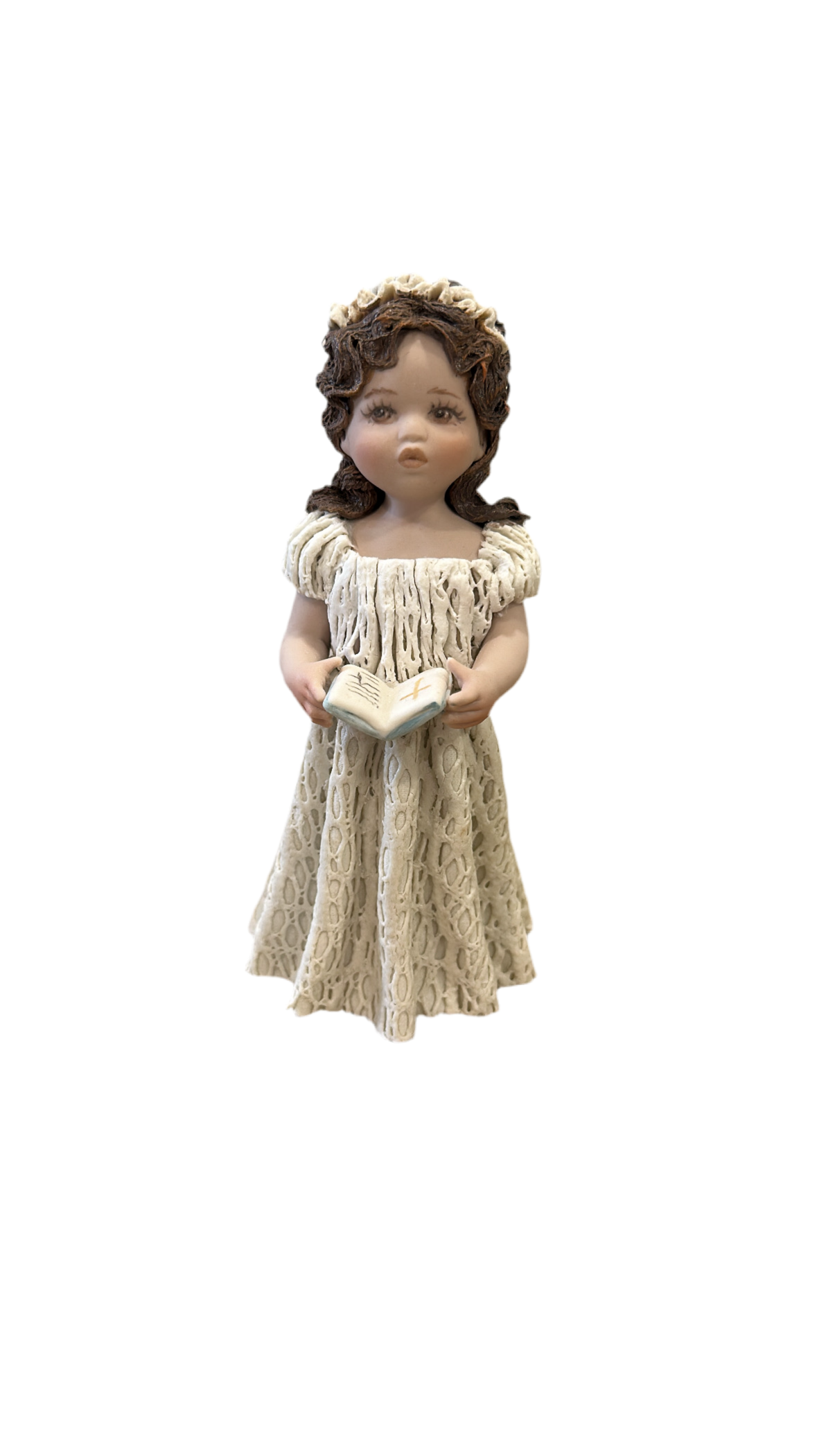Figura in porcellana raffigurante una bimba pronta per la prima comunione, in piedi con in mano un libretto. Indossa un abito bianco lungo in pizzo bianco e porta i capelli sciolti sulle spalle, con una coroncina di pizzo bianco.