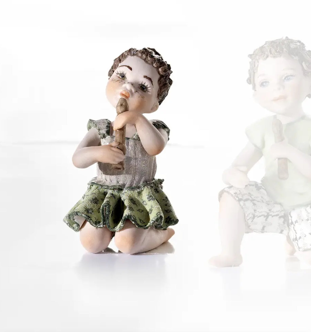 Ogni oggetto prodotto da Sibania è assolutamente unico sia nella realizzazione di ogni singolo pezzo sia nella tecnica di produzione che non ha eguali e che lo rende difficilmente imitabile. Questi articoli sono interamente modellati e dipinti a mano nel nostro laboratorio in provincia di Vicenza (Italia). Gli abiti sono sottili sfoglie di porcellana, su cui vengono serigrafate delle textures. Queste sfoglie vengono tagliate secondo il modello di abito e poi applicate con pazienza sul corpo della statua. Anche le acconciature dei capelli sono realizzate a mano di volta in volta. Sul cotto a “bisquit” i visi, gli abiti e gli accessori vengono dipinti con colori atossici; il pezzo subisce infine un’ulteriore cottura detta “terzo fuoco”. Ulteriori eventuali dettagli come le corde dei violini o i cavalletti delle vespe sono applicati a questo punto sul pezzo finito.