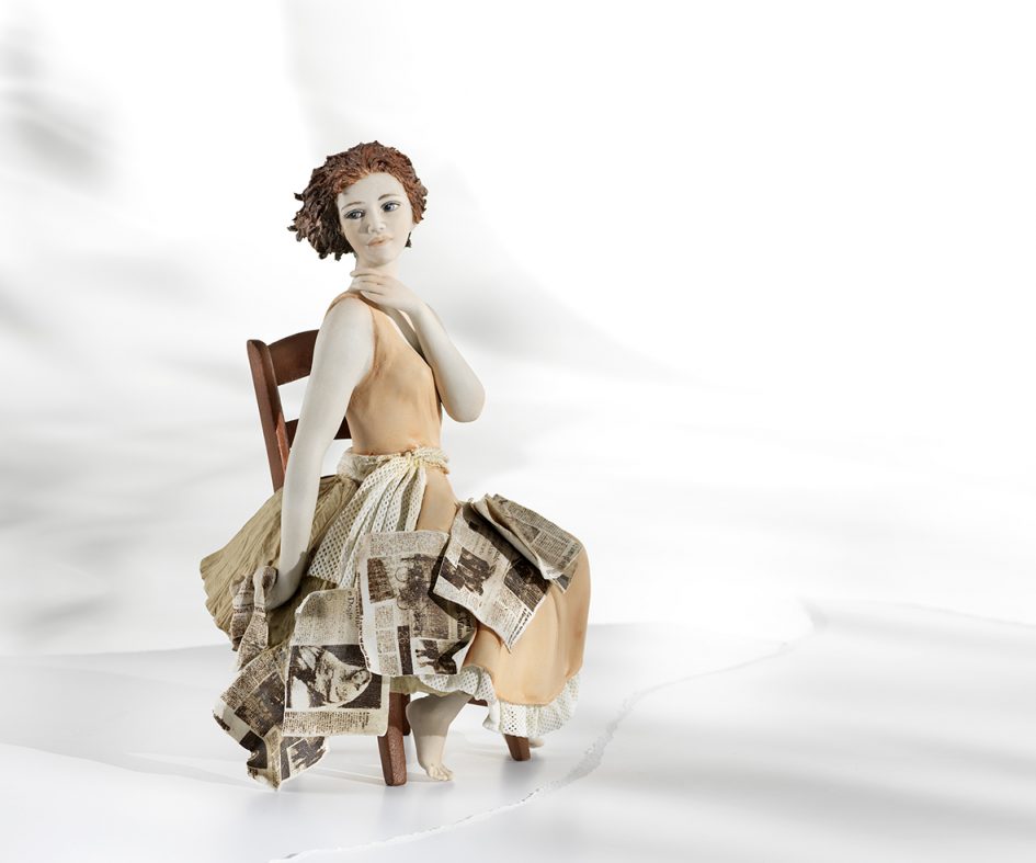 Figura in porcellana allegoria dell’autunno. Si presenta come una donna in abito salmone, con un inserto nella gonne color fango e una cintura di morbido tulle. Siede su una sedia di un caldo marron rosso e tiene in grembo dei fogli di giornale che il vento sta pian piano portando via, mente lei si volta quasi indietro a rivedere i suoi Giorni d’Autunno.
