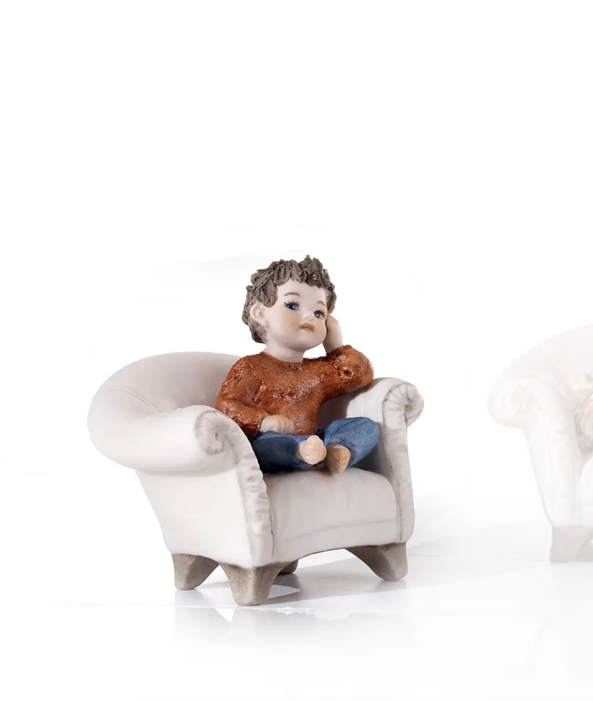 Figura in porcellana raffigurante un bimbo seduto su una poltroncina bianca, con un cuscino giallo.