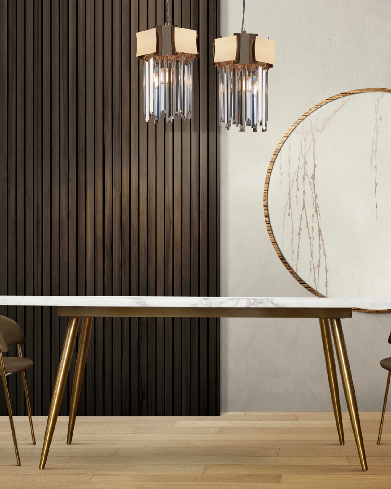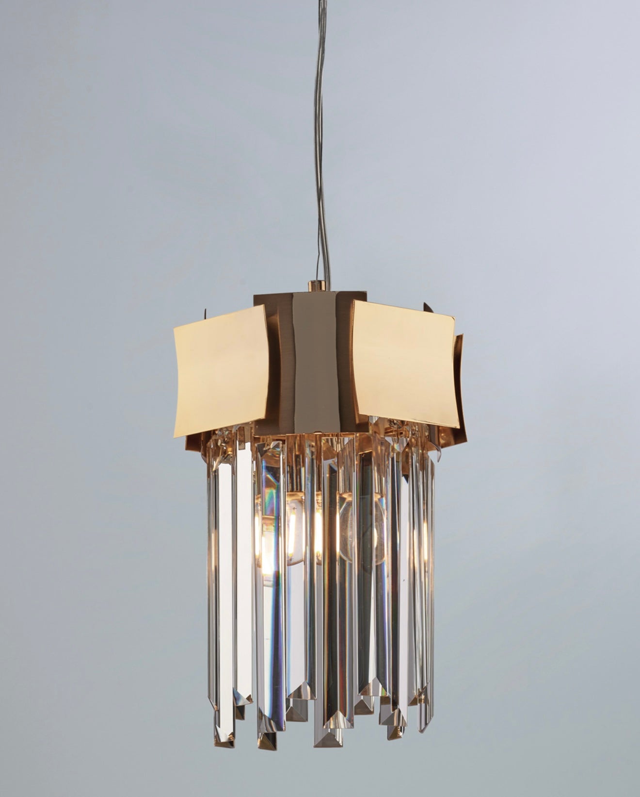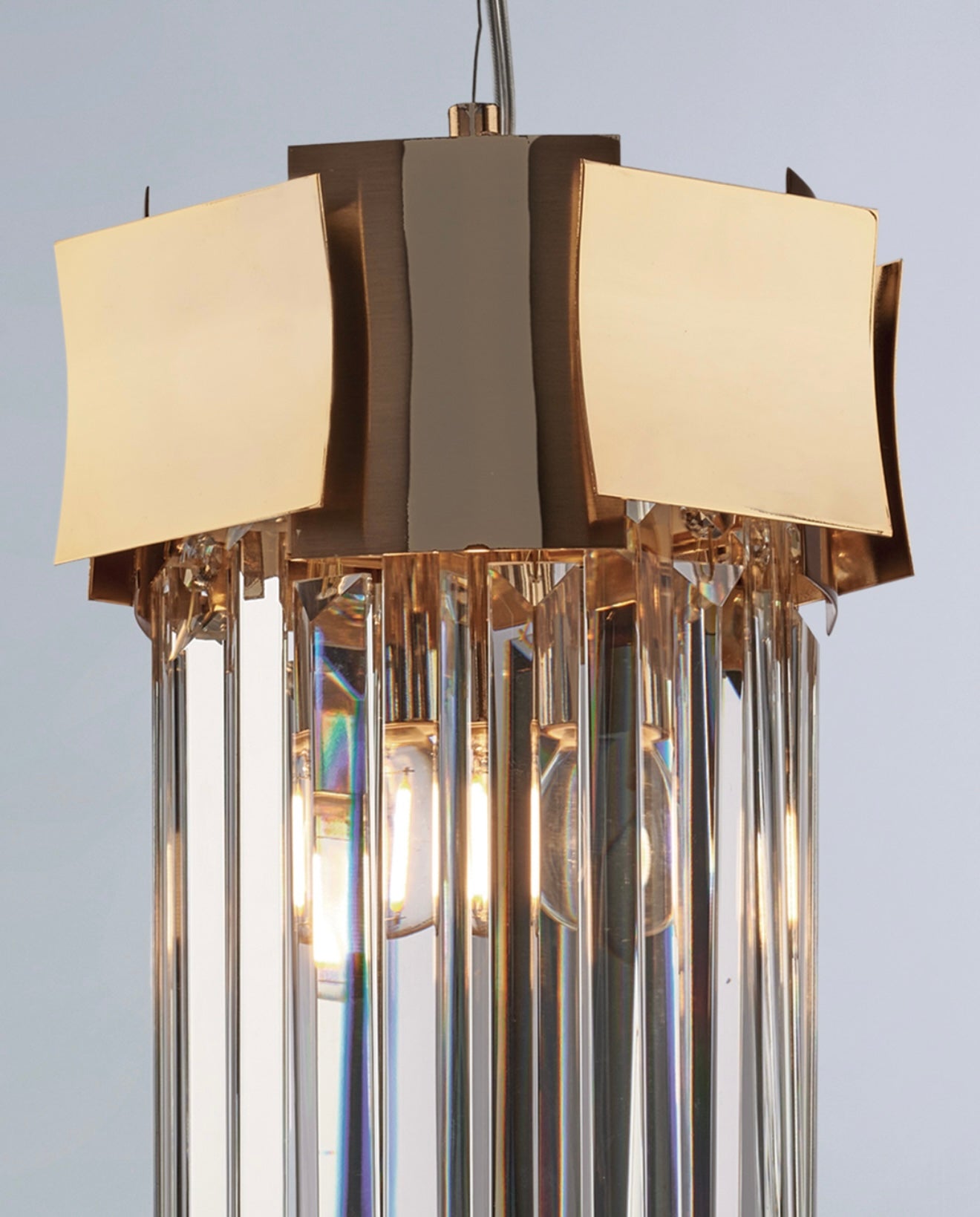 La sospensione a lampadario su due piani a 10 luci (il primo cerchio 6luci, il secondo ne supporta 4 luci) in cromo oro lucido e satinato con il particolare dei suoi cerchi in forma rettangolare.