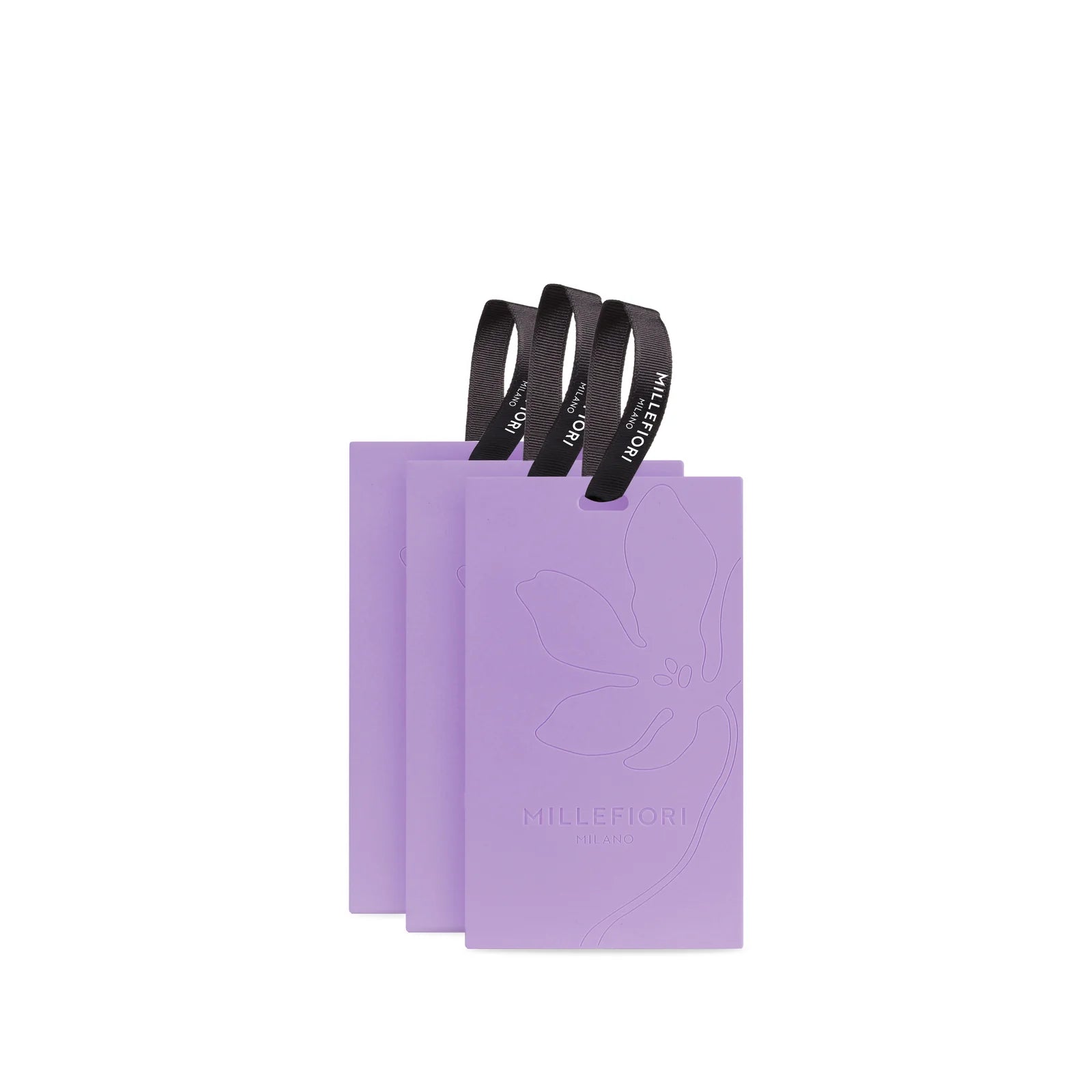 Tessere profumate colorate in confezione da tre, con logo Millefiori Milano e fiore decorativo inciso sul fronte e sul retro. Le tessere profumate possono essere riposte nei cassetti o appese nell'armadio grazie al pratico nastrino.