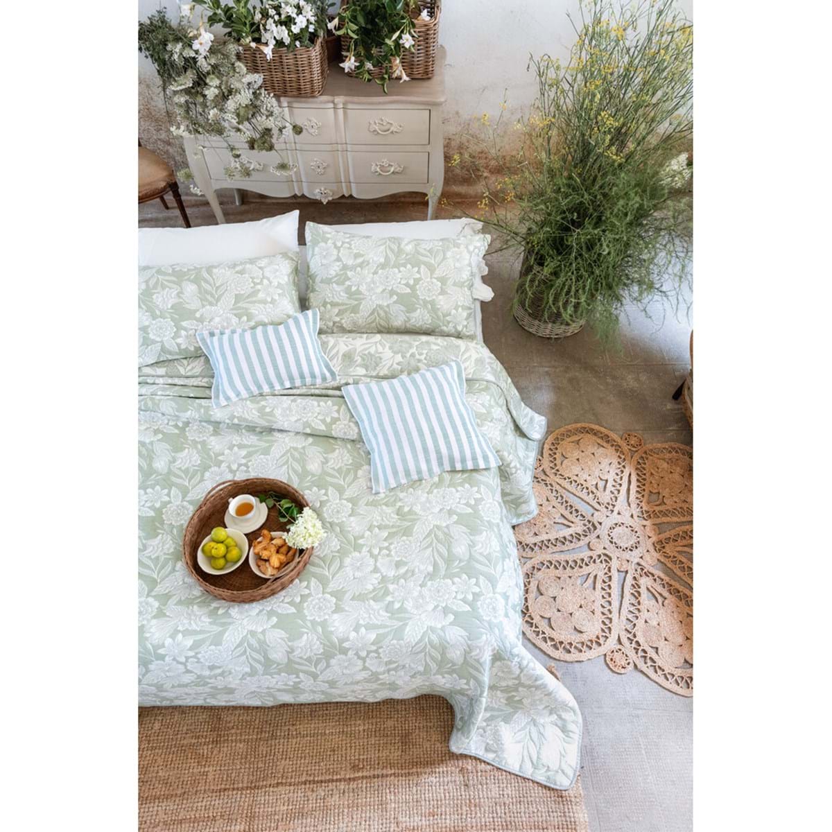 Questa trapunta matrimoniale serie 'Lady' è perfetta per arredare la tua camera da letto con un tocco di primavera. Stampata con fiori verdi e bianchi, dona un'atmosfera fresca e allegra. È ottima per letti matrimoniali e offre il massimo comfort durante il sonno.