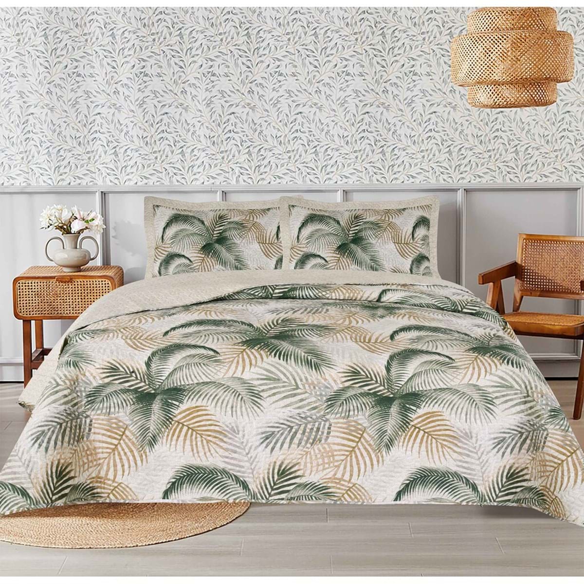 Questa trapunta matrimoniale con due copriguanciali compresi della serie 'Simple Border' è perfetta per arredare la tua camera da letto con un tocco di tropicale. Stampata di palme beige e verdi, dona un'atmosfera fresca e allegra. È ottima per letti matrimoniali e offre il massimo comfort durante il sonno.